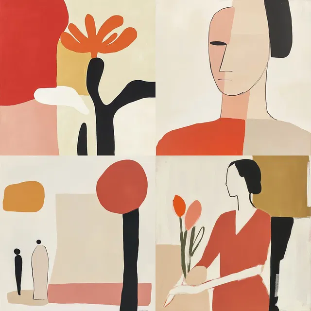 Сдержанная минималистичная абстракция отличается использованием плоских, ярких форм и приглушённой цветовой палитры. Это создаёт яркий, но простой визуальный язык.