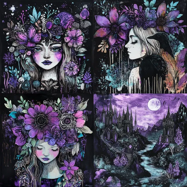 Этот стиль отличается детальной прорисовкой, замысловатыми линиями и насыщенным фиолетовым цветом. Он создаёт мистическую атмосферу, напоминающую об искусстве модерн и символизме. Композиции этого стиля сложные, с витиеватыми узорами и декоративными элементами, которые формируют сказочную обстановку.