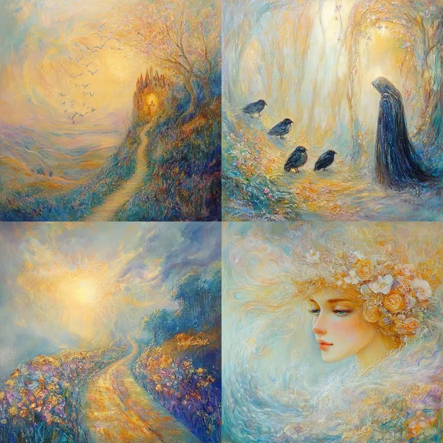 Этот стиль пленяет своей воздушностью и сказочностью, впечатляя своей импрессионистичностью и причудливостью. Мягкие градиенты и пастельные тона создают мистическую атмосферу, напоминающую пейзажи Моне и декоративную элегантность Климта. Органичные формы и плавные линии усиливают очарование повествования, вдохновлённого романтизмом и модерном.
