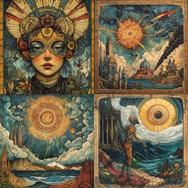 Этот стиль отличается детальной проработкой и сложной композицией. Он напоминает об искусстве модерна и символизма с примесью мифических сюжетов. Преобладают тщательно прорисованные линии и витиеватые узоры, которые создают небесную и чарующую атмосферу. Богатая палитра синих и золотистых оттенков усиливает мистическое и легендарное звучание, а героями иллюстраций часто становятся мифические персонажи или обитатели небесных пейзажей.