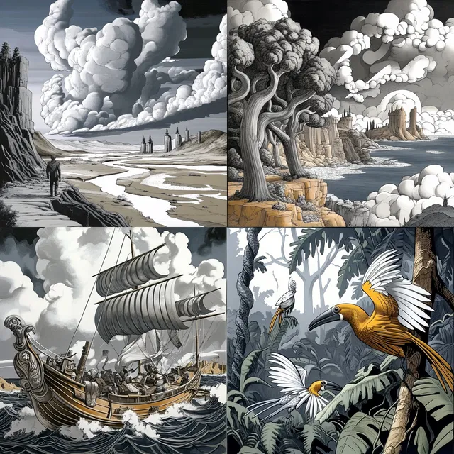 Монохромная палитра, дополненная тонкими оттенками и земляными тонами, усиливает сюрреалистичную атмосферу и сказочное качество. Хотя сила стиля заключается в детальной штриховке и богатстве текстур, в более реалистичных контекстах ему может не хватать фотореализма.
