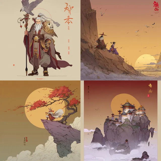 Этот стиль отличается сложной детализацией и запутанными композициями, в которых восточноазиатские мотивы переплетаются с фантастическими элементами. Богатые текстуры и тёплые земляные тона создают спокойную атмосферу, а мифологические темы и легендарные мотивы придают произведениям глубину повествования.