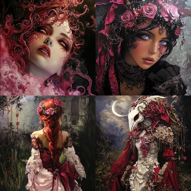 Сложные детали и насыщенные текстуры занимают центральное место, сплетая в единое целое элементы барокко и готики в стиле сюрреалистической фантазии. Этот стиль отличается мастерским созданием атмосферного освещения и драматических контрастов, придавая каждому произведению мистическое и чарующее качество.