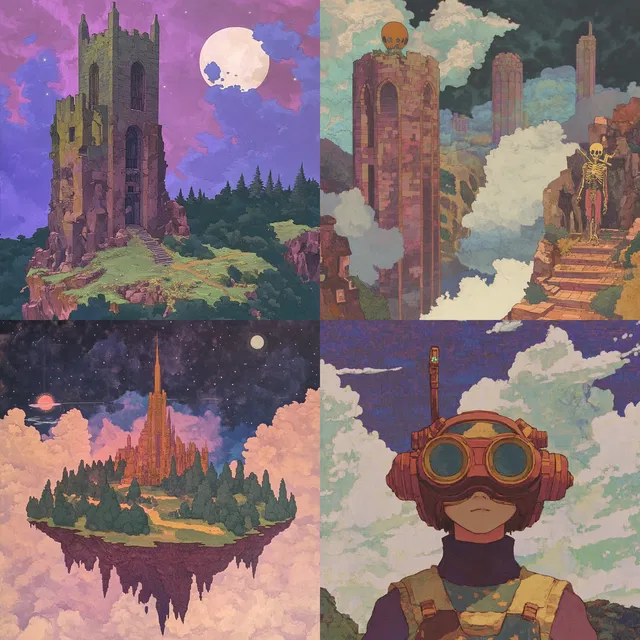 Этот стиль отличается яркими текстурами и сложными многослойными композициями. Он передаёт причудливую и игривую атмосферу в разнообразных темах. Его насыщенная цветовая палитра и детальные композиции создают сказочную атмосферу, напоминающую о ретрофутуристических и мифических сюжетах.