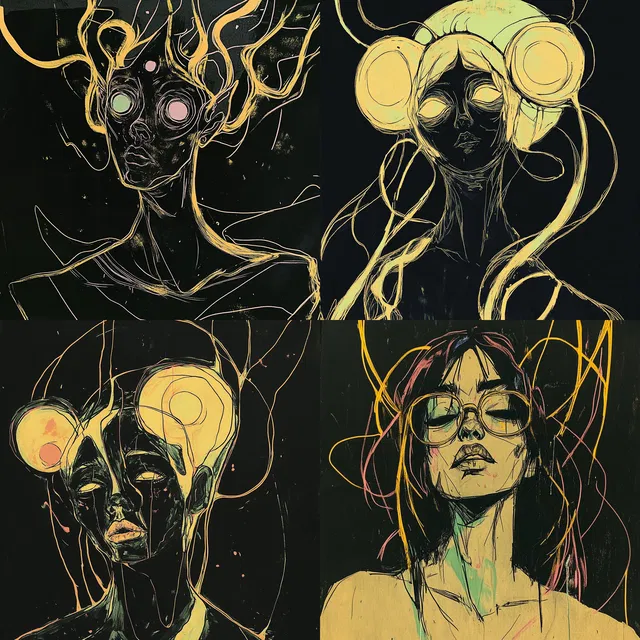 Этот стиль очаровывает своей плавной линейной работой и органичными формами, напоминающими модерн и символизм. Использование контрастных цветов на тёмном фоне создаёт сказочную атмосферу, а динамичные контуры и выразительные лица пробуждают глубокие эмоции.