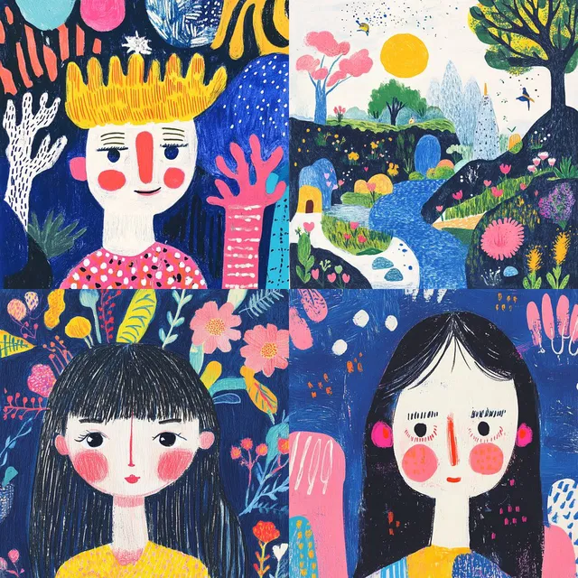 Тематика охватывает очаровательных персонажей, фантастические пейзажи и оживлённые городские сцены, наполненные чувством невинности и радости. Визуальный нарратив богат и изобретателен, что делает его идеальным для повествования и культурного самовыражения.