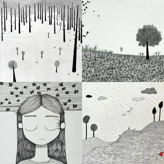 Этот стиль отличается причудливым, наивным шармом. В нём используются линейные техники и акцент на контурах, чтобы создать игривое и простое визуальное повествование. Монохромная палитра, часто чёрно-белая, подчёркивает детскую невинность и причудливое повествование.