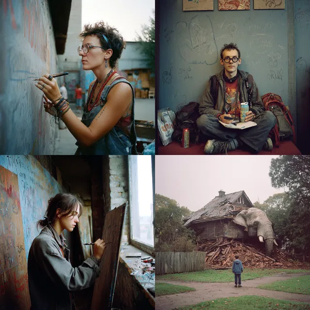 Текстурная насыщенность и глубина повествования определяют этот стиль, сочетающий городской реализм с сюрреалистическими и причудливыми элементами. Приглушённые тона и мягкое освещение создают ностальгическую и сказочную атмосферу, а сложные детали и многослойные композиции усиливают визуальное повествование.