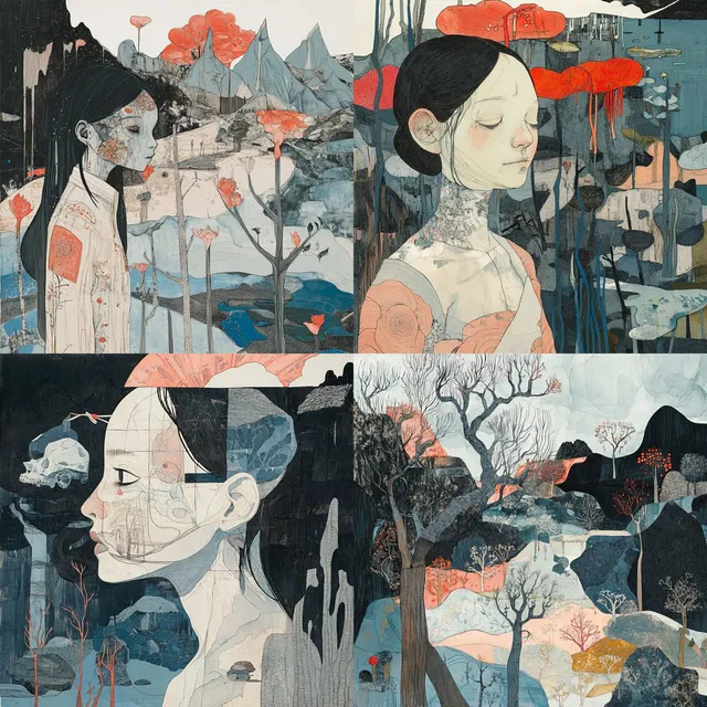 «Ethereal Dreamscapes» очаровывает своей сложной линейной графикой и тонкой штриховкой, создавая гармоничное сочетание природы, архитектуры и человеческих фигур. Использование приглушённых цветов и мягкого освещения создаёт неземную атмосферу, а динамичные контрасты и богатство текстур добавляют глубины и интриги. Геометрические узоры и абстрактные формы переплетаются с архитектурными элементами, создавая сложную, но сбалансированную композицию.