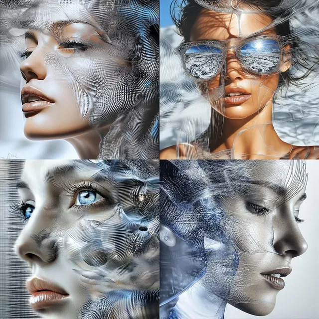 Этот стиль завораживает игрой света и текстуры, пленяя футуристичностью и эфемерностью. Изображения отличаются металлическим блеском, преимущественно в синих и серебряных оттенках, что создаёт высококонтрастный и светящийся эффект. Замысловатые узоры и плавные формы намекают на движение и трансформацию, а детальные текстуры добавляют глубины и сложности.