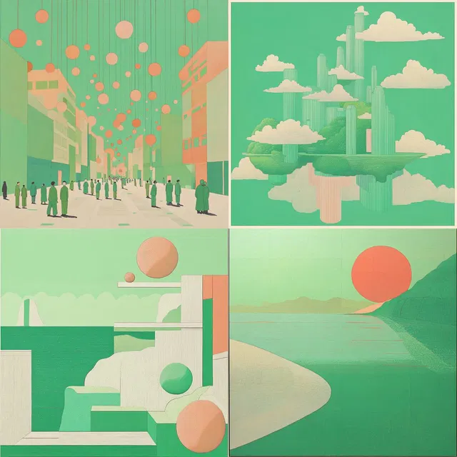 Этот стиль использует минималистичный подход, применяя геометрическую абстракцию для создания спокойных пейзажей мечты. Мягкие пастельные оттенки создают умиротворяющую атмосферу, а структурированные композиции и повторяющиеся узоры вызывают ощущение модернистского дизайна.