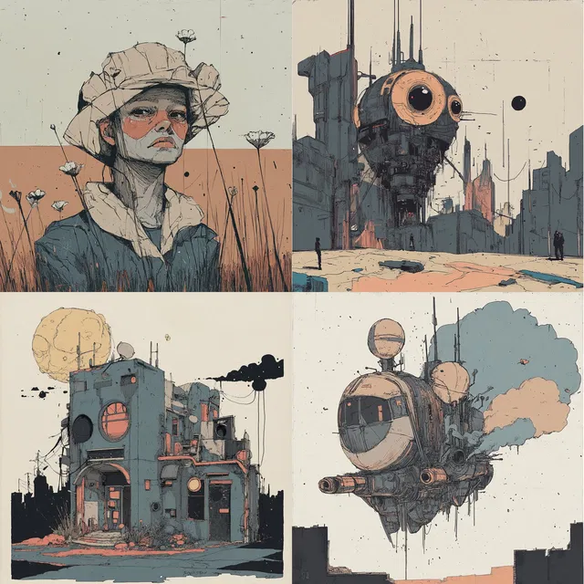 Отличительный ретрофутуристический стиль, который характеризуется тщательной прорисовкой линий и геометрической точностью. Приглушённая цветовая палитра усиливает атмосферу неонуара, создавая ощущение городской изоляции и антиутопического футуризма. Этот стиль особенно хорош для иллюстрации сложных архитектурных форм и сюжетов, связанных с технологиями, но иногда ему сложно передать фотореализм и динамичное движение.