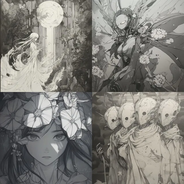В этом стиле преобладают замысловатые линии и детальные композиции, которые создают сюрреалистичную и воздушную атмосферу на разные темы. Монохромная палитра усиливает контрастность и текстурированность, придавая сказочность как футуристическим, так и фантастическим сюжетам.