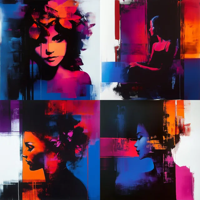 Этот стиль отличает поразительное сочетание ярких цветов и абстрактных форм. Он характеризуется смелым использованием неоновых оттенков и динамичными композициями. Визуальное напряжение, созданное за счёт многослойной абстракции и контрастов текстур, вызывает ощущение электрической энергии. Поэтому стиль прекрасно подходит для современных и футуристических тем.