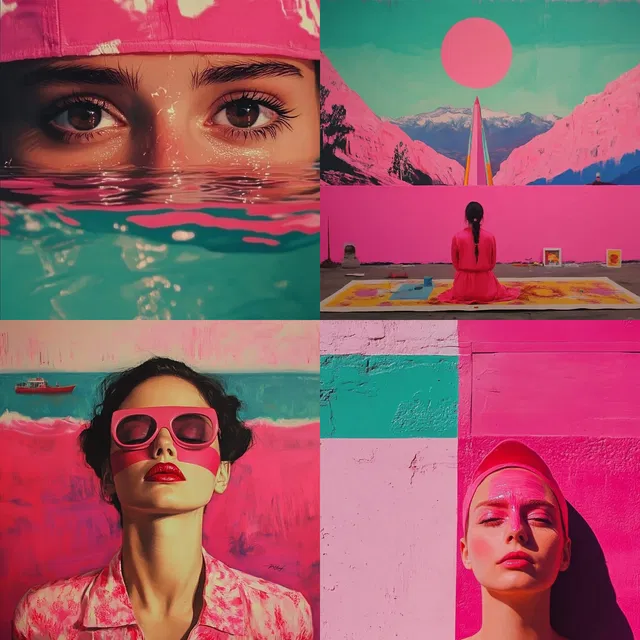 В этом стиле преобладает яркий сюрреализм с насыщенными розовыми и интенсивными оттенками мадженты, которые создают живой сказочный пейзаж. Характерны игровые композиции и причудливые аранжировки, а смелые контрасты и поразительные противопоставления усиливают визуальную интригу.