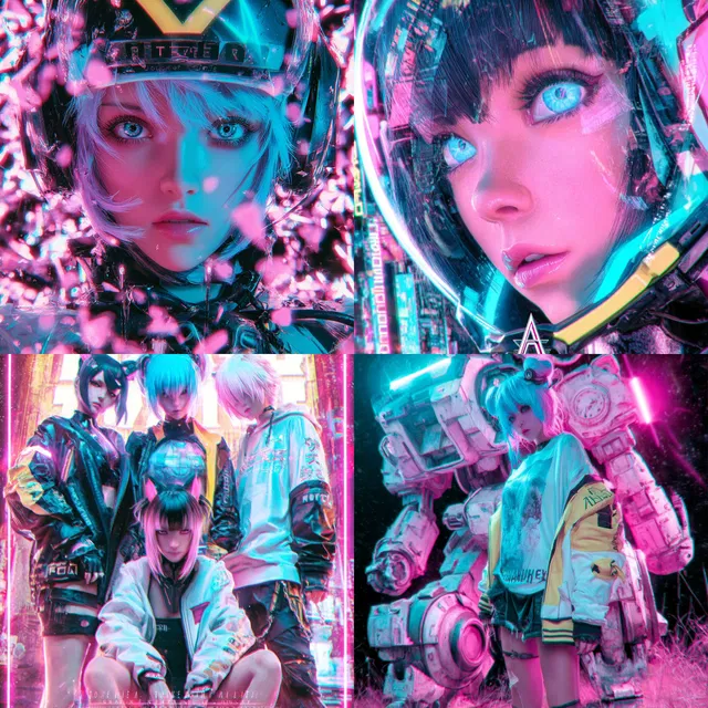 Этот стиль с яркой неоновой эстетикой завораживает своей электризующей яркостью и футуристическим шармом. В нём преобладает палитра неоново-розовых и электрически-синих оттенков. Композиции насыщены светящимися деталями и энергией киберпанка.