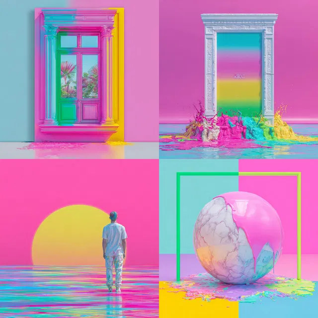 Доминирует неоновая яркость с поразительным использованием насыщенных цветов и яркого света. Стиль отличается созданием игривого изобилия и радостной энергии благодаря высокой насыщенности и резким контрастам. Неоновые градиенты и светящиеся переходы усиливают визуальный динамизм, а чёткие контуры и выраженные края сохраняют ясность.