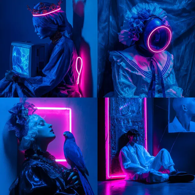 В этом стиле неоновое освещение играет ключевую роль, создавая эфемерную и футуристическую атмосферу в визуальных повествованиях. Игра светящихся синих и пурпурных оттенков придаёт сюрреалистичное свечение, усиливая сказочность каждой композиции. Неоновые элементы искусно вплетены в дизайн персонажей и архитектурные формы, создавая целостную, но потустороннюю эстетику.