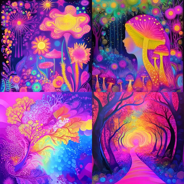 Этот стиль поражает своей яркостью и насыщенностью красок. Он использует психоделическую палитру, наполняя каждое изображение неоновой энергией. Визуальный язык характеризуется светящимися оттенками и яркими контрастами, создавая динамичную и электризующую атмосферу.