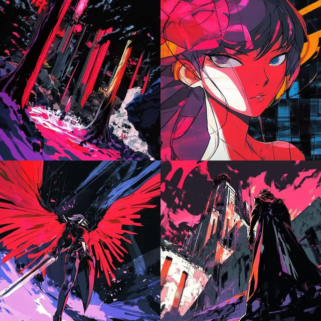 Этот стиль поражает яркими неоновыми цветами и динамичными композициями. В нём сочетаются футуристические мотивы с выразительными, смелыми линиями. Использование высокого контраста и драматического освещения усиливает визуальный эффект, создавая ощущение движения и энергии. Геометрические и абстрактные элементы сочетаются с иллюстративными техниками, в результате чего получается стиль, который одновременно выглядит современно и вне времени.