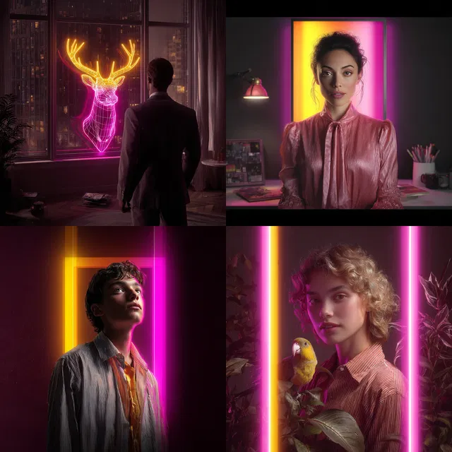 Визуалы с неоновым освещением доминируют, создавая футуристическую атмосферу благодаря сияющему свету и динамичному освещению. Стиль отличается смелыми контрастами и яркими цветами, особенно неоново-розовым и ярко-жёлтым, что усиливает научно-фантастическую и футуристическую тематику.