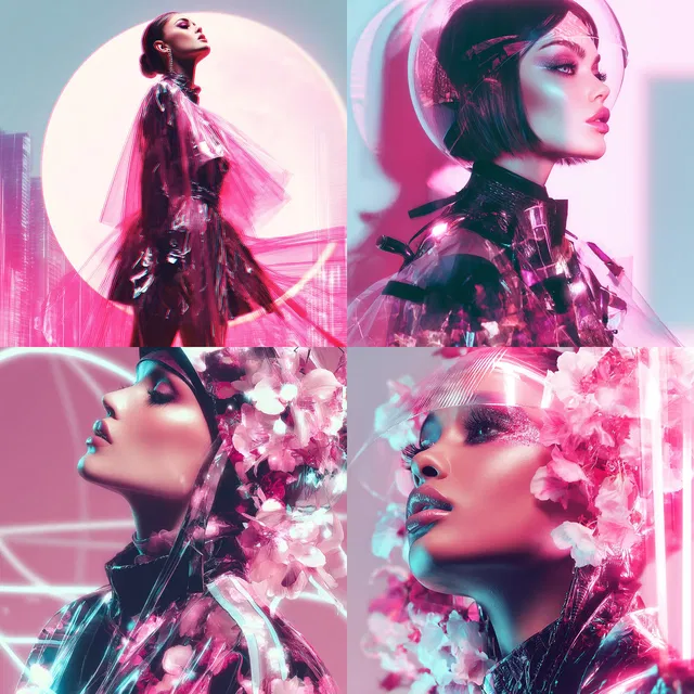 Использование неоново-розовых и насыщенно-синих оттенков в сочетании с высококонтрастным освещением вызывает ощущение чего-то сказочного, которое пронизывает каждое произведение. Доминируют отражающие поверхности и зеркальные отблески, усиливающие футуристическую и авангардную привлекательность.