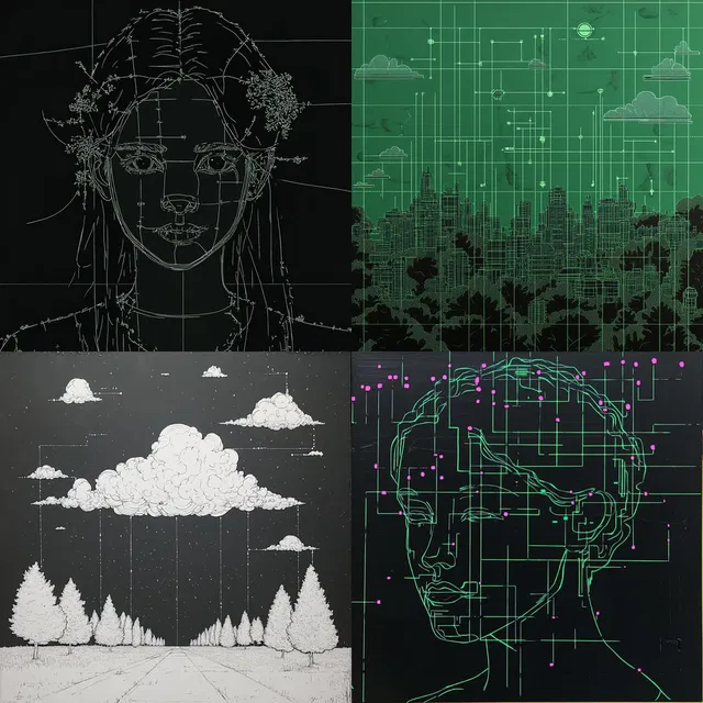Визуальный стиль «Neon Grid Aesthetic» представляет собой яркое сочетание линейных и сеточных изображений, подчёркивающих структурированные и геометрические формы. В основе стиля — техническая точность, создающая аналитические и схематичные композиции, которые вызывают ощущение современности и футуризма.