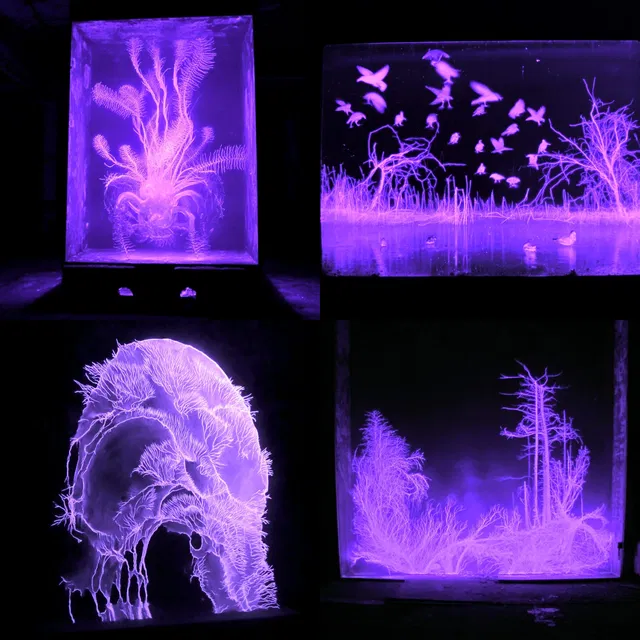 В этом стиле преобладает неоновая люминесценция, которая характеризуется сиянием и неземным светом. Светящиеся детали и полупрозрачные текстуры создают сюрреалистичную атмосферу, вызывая потустороннее и мистическое настроение.