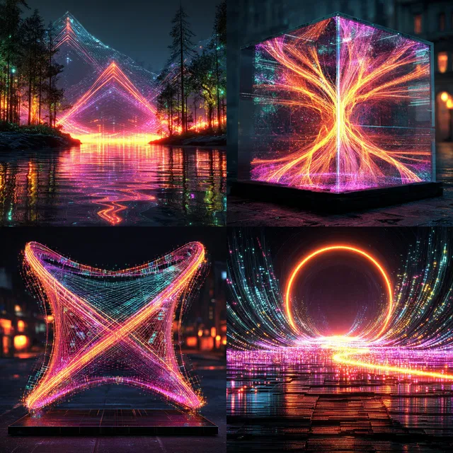 Этот стиль — ослепительное исследование искусства, наполненного неоновыми красками. Он завораживает своим сиянием и кристальной ясностью. Его техническое мастерство определяют неоновые сетки и светящиеся схемы, а яркие оттенки и мерцающие контрасты создают атмосферу футуризма.