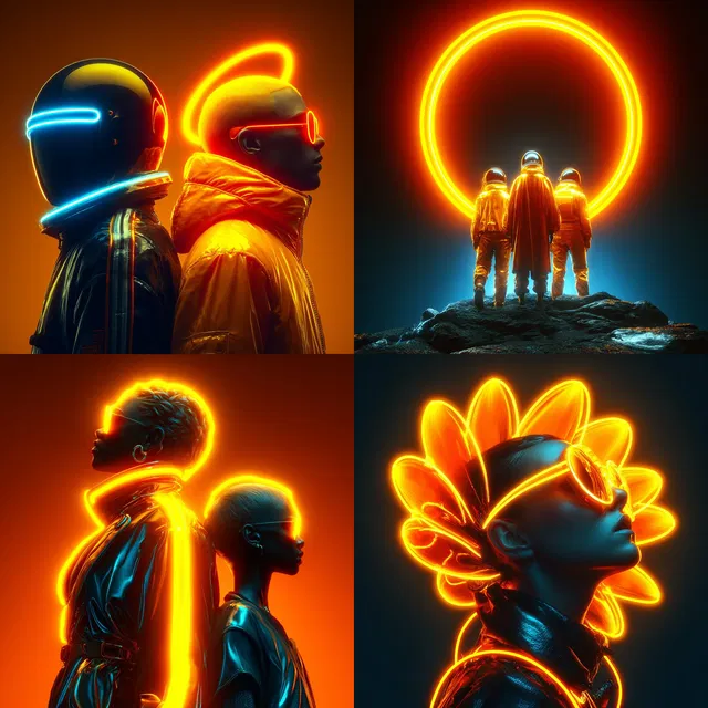Преобладают яркие неоновые оттенки, создавая поразительный контраст между насыщенным синим и сияющим оранжевым. Стиль прекрасно подходит для создания футуристических сюжетов с помощью ярких контрастов и светящихся контуров, вызывая ощущение научно-фантастического чуда. Персонажи и окружение окутаны сияющей аурой, усиливающей их потустороннее присутствие.