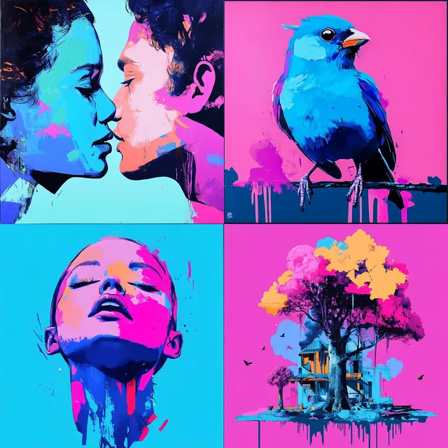 Стиль Neon Pop Fusion завораживает своей смелой, яркой палитрой и выразительными мазками кисти, вдохновлёнными поп-артом и современной эстетикой. Эффектные композиции и многослойные текстуры создают динамичное визуальное впечатление, гармонично сочетая человеческие фигуры, животных и городские пейзажи.