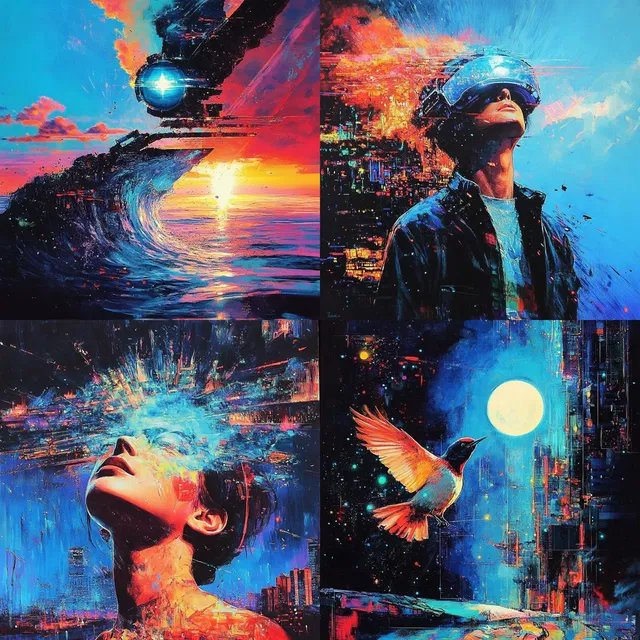 Этот стиль насыщен неоновыми цветами и динамичными композициями. Он представляет собой футуристическое видение, в котором кибернетические элементы сочетаются с мечтательной атмосферой.