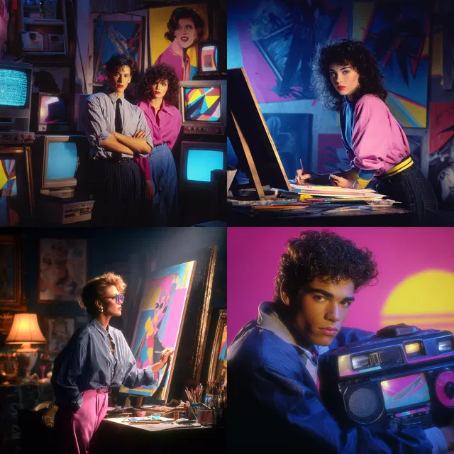 Доминируют яркие цвета и насыщенные оттенки, создавая ностальгическую, но энергичную атмосферу, напоминающую 1980-е годы. Неоновые акценты и флуоресцентные вставки придают изображениям электрическое сияние, а мягкие градиенты и плавные переходы добавляют глубины и объёма.