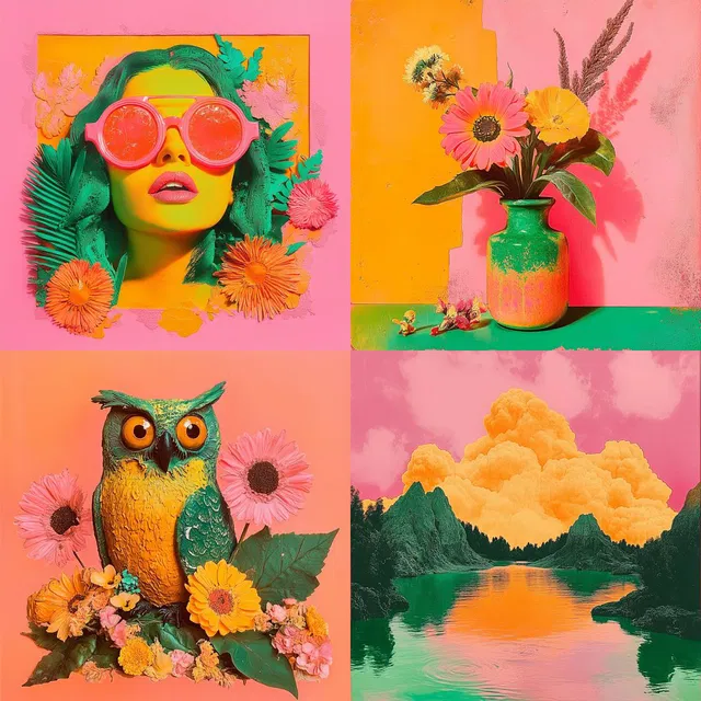 Этот стиль наполнен яркими красками и насыщенными цветами, он воплощает игривую и сюрреалистичную эстетику, напоминающую поп-арт. Использование смелых, контрастных цветов, таких как неоново-розовый, зелёный и оранжевый, создаёт динамичную и привлекающую внимание визуальную композицию.