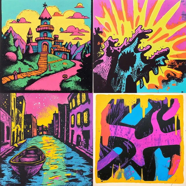 Доминируют яркие неоновые цвета, создавая поразительный визуальный эффект, напоминающий поп-арт и стили комиксов. Толстые линии и контуры подчёркивают формы, придавая им мультяшный, преувеличенный вид.
