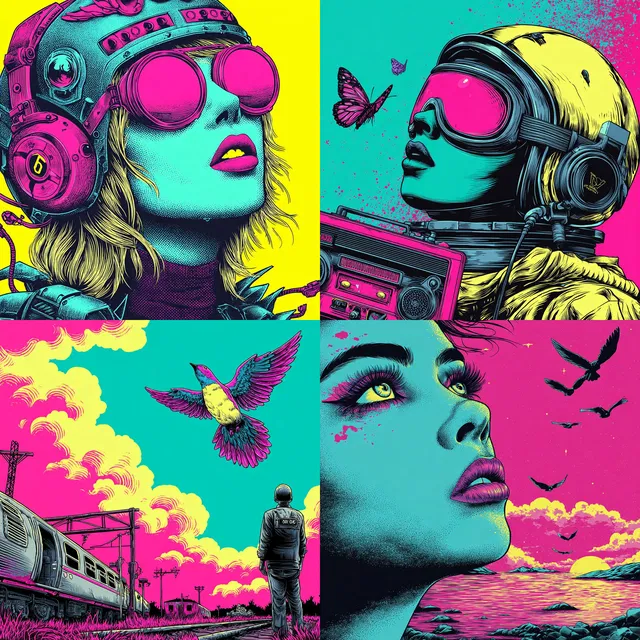 Ярко-неоновые цвета и чёткие контуры определяют этот стиль, в котором сочетаются влияние поп-арта и темы ретрофутуризма. Электрическая энергия и динамичная яркость создают поразительный визуальный эффект, напоминающий поп-культуру 1980-х годов и эстетику комиксов. Графическая точность и высокий контраст усиливают способность стиля передавать одновременно ностальгию и футуристичность.