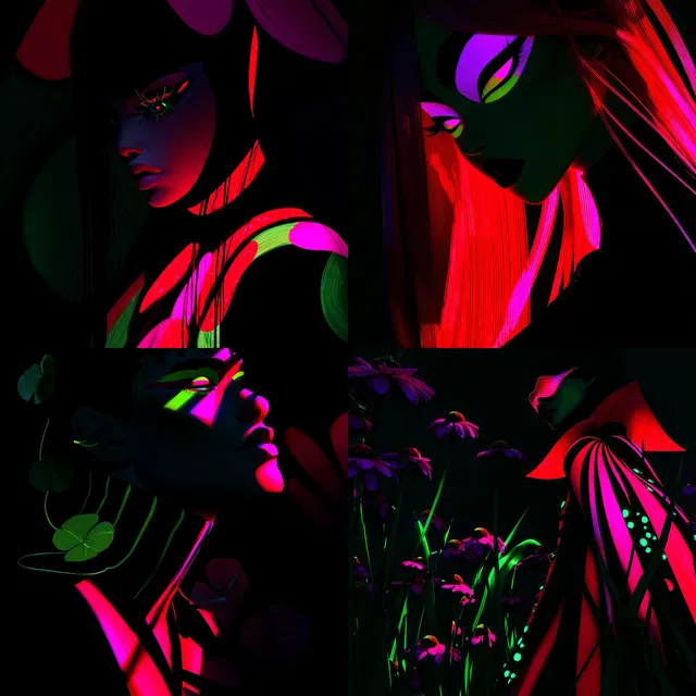 Такой подход отлично подходит для футуристических и авангардных контекстов, предлагая уникальное визуальное повествование, которое захватывает и интригует. Однако зависимость от неоновых оттенков может ограничить универсальность этого стиля в более традиционных или фотореалистичных приложениях.