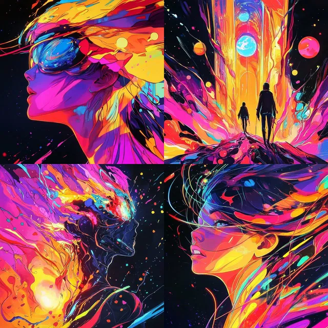 Этот стиль поражает яркими цветами и динамичными композициями. Он привлекает внимание зрителя благодаря смелому использованию неоновых оттенков и плавных форм. Игра света и тени создаёт ощущение глубины и движения, а абстрактные и сюрреалистичные элементы придают картине сказочное качество.