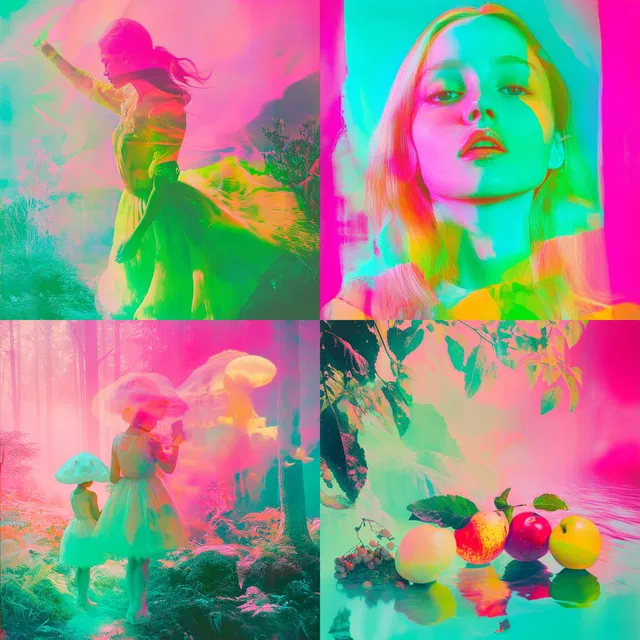 Этот стиль, наполненный неоновым сюрреализмом, завораживает своим неземным сиянием и динамичными композициями. Здесь преобладают яркие цвета, создающие сказочную абстракцию, которая объединяет элементы фантастики и футуризма. Многоуровневая сложность и замысловатые наложения создают ощущение глубины, а плавные переходы и геометрические взаимодействия придают современный вид.
