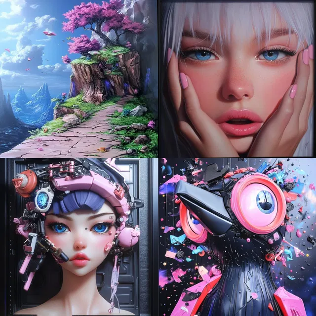 «Neon Dreamscapes» очаровывает своей яркой палитрой и гиперреалистичными деталями, сочетая в себе сюрреалистические элементы и замысловатые узоры. В работах преобладают футуристические мотивы, создающие стильные высокотехнологичные визуалы, которые отсылают к постмодернизму и цифровому футуризму.
