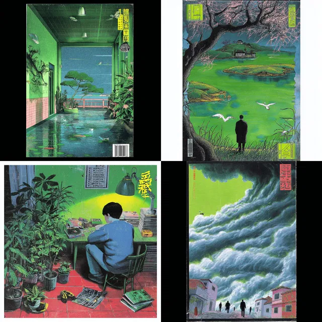 Яркие зелёные и неоновые акценты доминируют в визуальном ландшафте, создавая сюрреалистичную и сказочную атмосферу. Стиль отличается умением сочетать элементы ретрофутуризма со сложной детализацией, в результате чего получается уникальное слияние сюрреализма и эстетики киберпанка. Выразительные персонажи и динамичные композиции усиливают глубину повествования, а использование смелых контрастов и насыщенных оттенков добавляет визуального воздействия.