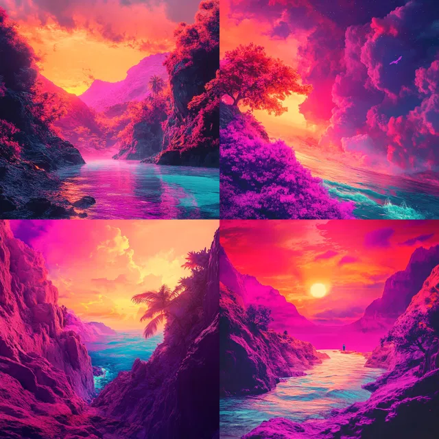Здесь преобладают яркие неоновые оттенки, которые создают неземную, сказочную атмосферу в самых разных темах. Стиль отличается умением сочетать смелые цветовые контрасты с динамичными композициями, в результате чего получаются выразительные и светящиеся визуалы.