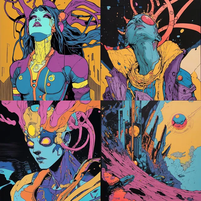 Этот стиль отличается яркими контурами и насыщенной неоновой палитрой. В нём сочетаются эстетика графических романов и футуристические темы. Он особенно хорош для создания динамичных композиций и сложных деталей, особенно в контексте научной фантастики и киберпанка.
