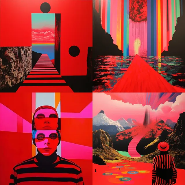Доминируют яркие цвета и смелые геометрические формы, создавая сюрреалистичные и динамичные визуальные впечатления. Стиль отличается использованием неоновых оттенков, особенно красного и розового, для создания ярких контрастов и энергичных композиций.