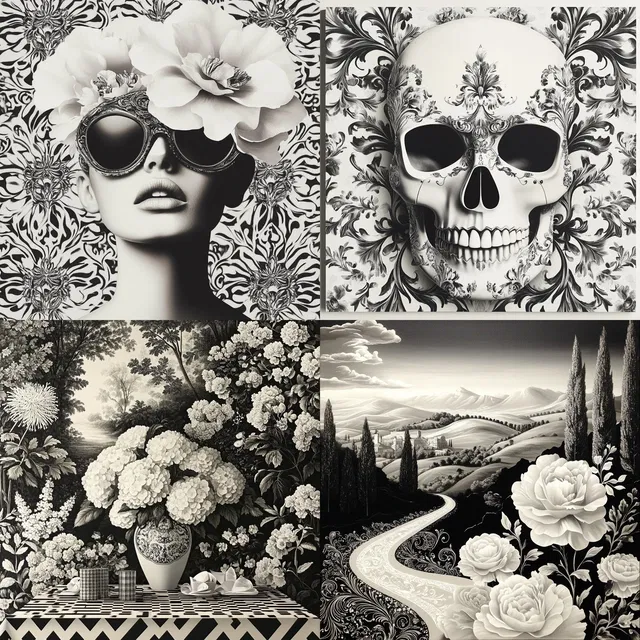 Преобладают сложные чёрно-белые композиции, демонстрирующие склонность к изысканным деталям и сложным узорам. Монохромная палитра этого стиля подчёркивает его влияние барокко и рококо, создавая вневременную, но современную эстетику. Архитектурные элементы высокие и симметричные, а образы персонажей излучают царственный, благородный вид.