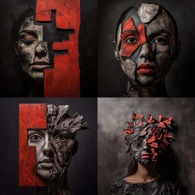 Этот стиль отличается богатым сочетанием текстур и скульптурных форм. Он создаёт яркие контрасты и символические образы. Постоянная красно-чёрная палитра усиливает сюрреалистичную и таинственную атмосферу. Фрагментарные композиции и органические формы вызывают ощущение исследования идентичности и культурных мотивов.