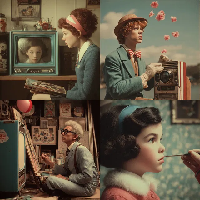 В этом стиле отлично удаются выразительные персонажи и причудливые роботы. Он сочетает игривую фантастику с классическим реализмом. Ретрофутуристическая архитектура и смелая типографика усиливают ностальгическую составляющую, что делает стиль идеальным для винтажного брендинга и сторителлинга.