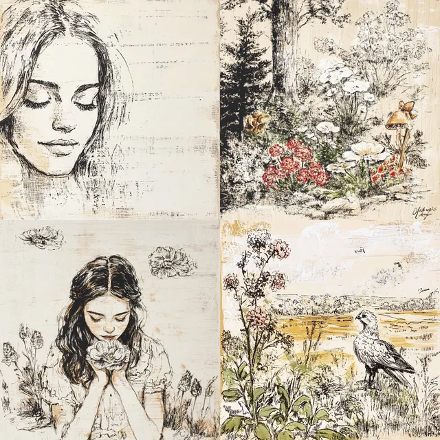 Текстурированные линии и органичная интеграция определяют этот стиль, вызывая ностальгические и натуралистические ассоциации. Детальные наброски и мягкие, землистые тона создают атмосферу мечты, напоминающую романтическое и пасторальное искусство.