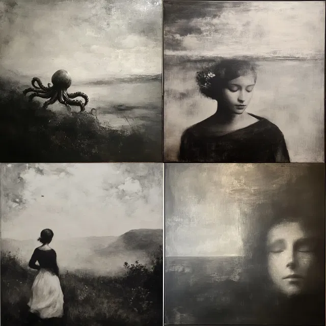 Это направление отличается ярким сочетанием монохромных тонов и атмосферной глубины. Оно вызывает чувство ностальгии и меланхолии. Визуальный рассказ обогащается за счёт текстурного богатства и многослойной манеры письма, создавая запоминающиеся композиции, которые перекликаются с влиянием романтизма и символизма.