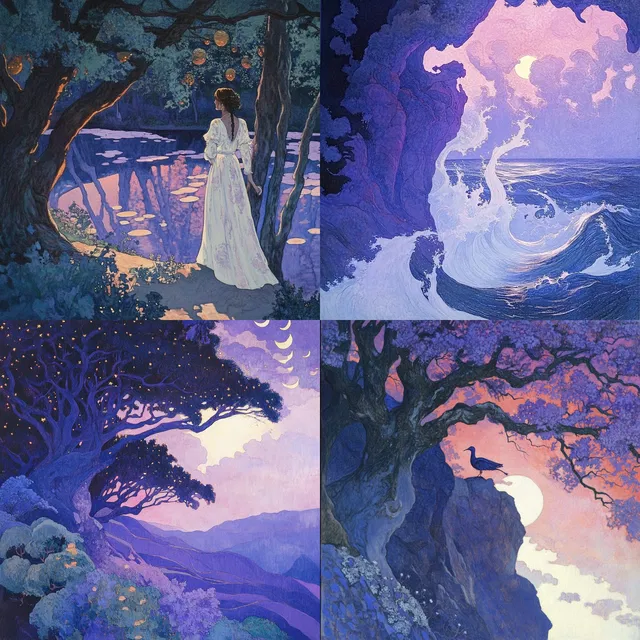 Этот стиль, воздушный и словно из сна, воплощает суть модерна благодаря своей яркой цветовой палитре и замысловатой прорисовке. В каждую композицию вплетены романтические и мифические темы, создающие сюрреалистичную атмосферу, которая очаровывает зрителя.